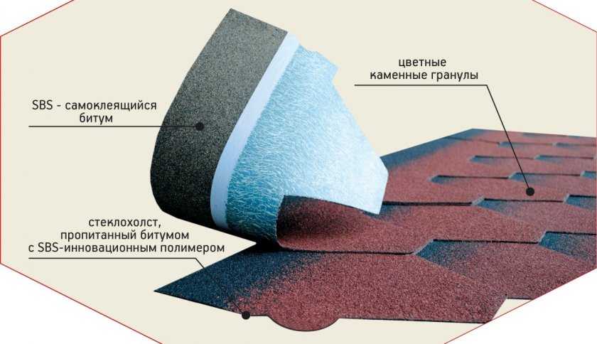 Гибкая галька — это прямоугольная стекловолоконная галька, пропитанная битумом — связующим веществом. Асфальт наносится с обеих сторон и может быть окислен или модифицирован с помощью SBS. Второй вариант рекомендуется потому, что добавки стирола и бутадиена (SBS) придают материалу эластичность, увеличивают относительное удлинение, улучшают усталостные свойства и в целом продлевают срок службы плитки. Некоторые подрядчики говорят, что не имеет смысла платить большие деньги за черепицу с CBC-модифицированным битумом, если укладка происходит летом. Материалы, содержащие окисленный битум, теряют только в том, что в холодные месяцы они становятся более хрупкими, но в это время года проблему можно решить с помощью конструкции фена, который нагревает черепицу перед укладкой на крышу.