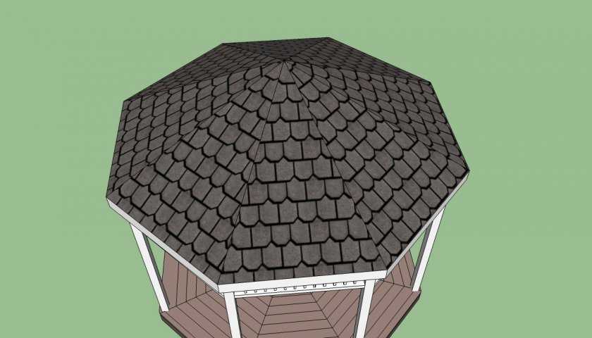 Скаты в шестигранном сооружении имеют треугольную форму одинакового размера. Первым нужно закрепить карнизный ряд, после чего монтируются последующие ряды с шагом в 1,5-2 см в шахматном порядке. Каждый гонт крепится кровельными гвоздями по краям, все боковые швы промазываются специальным клеем. Коньковой ряд монтируется из третей карнизных гонтов внахлест.