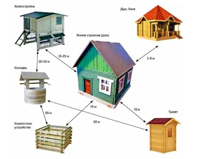- от жилого дома (и своего, и соседского) — 12-15 м;