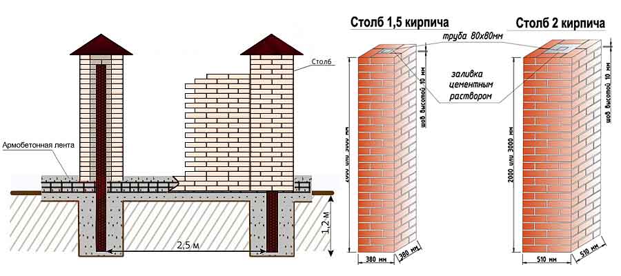 Для получения более прочного кирпичного столба лучше всего в середину опору помещать арматуру стержневого или трубчатого типа. Оптимальным вариантом является их заведение под уровень промерзания почвы и бетонирование.