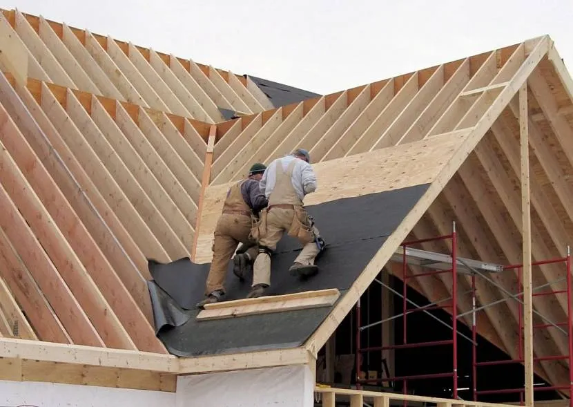 Перед укладкой обрешетки стропила покрывают слоем гидроизоляции, защищая ее от намокания. Гидроизоляция укладывается в горизонтальном направлении, начиная от карниза и поднимаясь вверх. Полосы настилают с напуском в 10-15 см, места стыков заклеивают скотчем.
