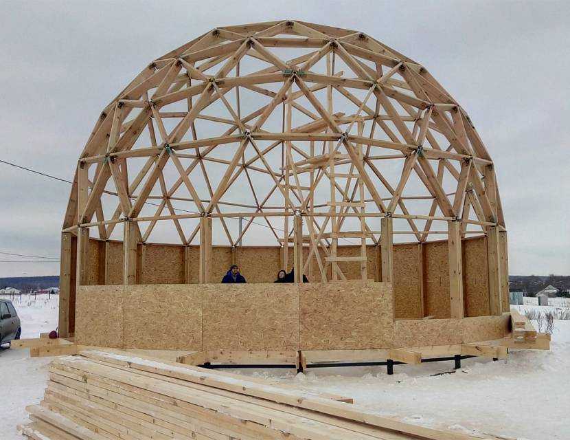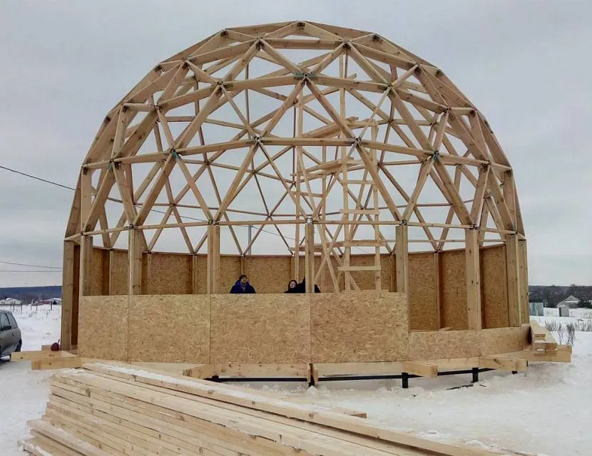 Такая сферическая крыша появилась в середине прошлого века в США. Ее особенность – отсутствие привычной системы стропил. Конфигурацию образуют равносторонние треугольные детали, сделанные из брусков метровой длины с сечением 5 на 10 см. Для соединения используется трубка-коннектор из стали 10 см, к которой посредством сварки попарно прикрепляют лопасти. В результате получается конструкция в форме звезды с 5 или 6 лучами. Иногда треугольники объединяют без коннекторов.