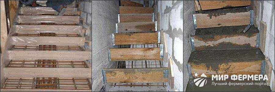 На начальном этапе бетонирования заливают две нижние ступени. При этом нужно внимательно следить, чтобы раствор тщательно заполнял все пустоты. В процессе также желательно периодически протыкать бетон каким-то острым предметом, чтобы убрать образовавшиеся воздушные полости, которые могут ослабить конструкцию.
