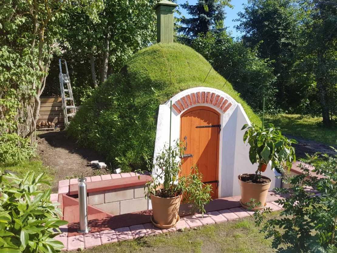 Из глубокой старины пришла конструкция наземного погреба. Устанавливают его в места с высоким уровнем грунтовых вод. Конструктивно он представляет собой помещение с углубленным в грунт на 50-100 см полом. Толстые стены не дают холоду добраться до овощей, на крышу нередко укладывают слой дерна. Для входа в наземный погреб делают тамбур.