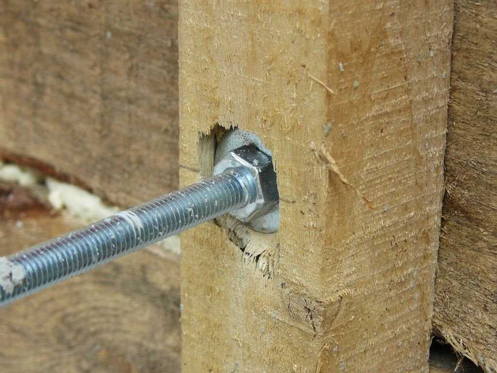 Отрезки труб вставляются внутрь конструкции, и через них и подготовленные заранее отверстия пропускается шпилька, на которой с двух сторон затягиваются гайки.