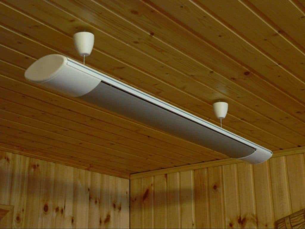 Важно! Устанавливая ИК лампу, необходимо помнить о том, что она сама сильно нагревается. Ее подвешивают к деревянному потолку не вплотную, а на расстоянии 30–50 см