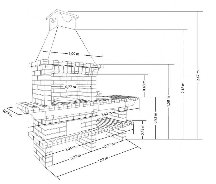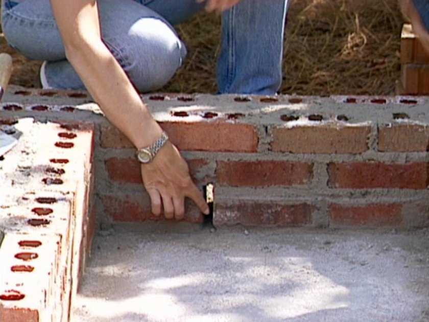 После окончания подготовительных работ можно переходить непосредственно к строительству стен мангала. Есть два способа выкладки: в форме буквы «П» или «Е». Оптимальной считается высота конструкции в 1 м. В простом варианте между боковыми сторонами мангала надо установить две чугунные решётки. На верхней можно готовить, на нижней — поддерживать огонь (над ней необходимо вывести дымоход). Между ними должно быть расстояние в 250 мм.