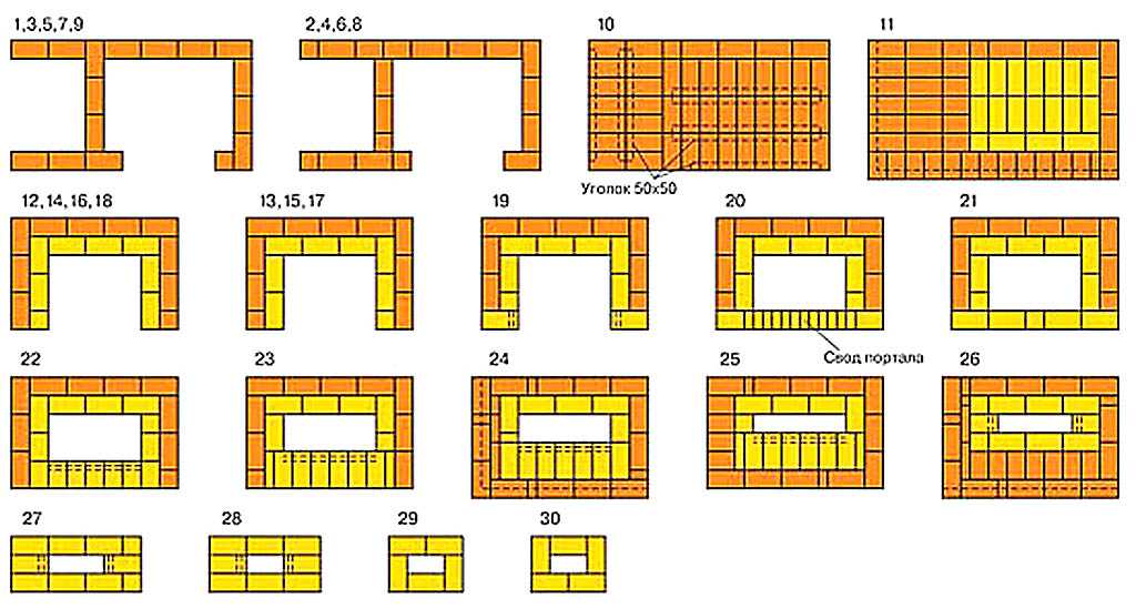Порядовка на печь-мангал для беседки, построенную по этому принципу, дана на рис. В этой же конструкции используется еще один принцип, см. ниже, но ее главный недостаток – довольно большое количество стальных закладных (10 ряд) и перевязок проволокой (ряды 22-28). Коэффициент термического расширения (ТКР) стали больше, чем у шамота и тем более у кирпича, а рабочий диапазон температур печи в беседке шире, чем у домовой, см. выше. Наличие стали в конструкции отрицательно сказывается на долговечности печи и требует особо тщательного выполнения работ по ее постройке.