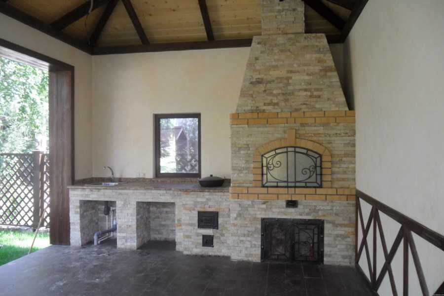 Самые простые конструкции кухонь открытого типа – фундамент и площадка из природного или искусственного камня, опора и крыша – деревянные. Если устанавливается печь – ее нужно облицевать камнем.