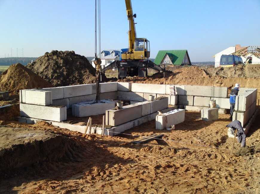 Ошибочно считать, что ширина блоков всегда равна толщине стен. Допускается выступание стены с одной стороны до 10 см, а если выступание двухстороннее, то до 6 см с каждой стороны. Обычно используются блоки разных размеров для наиболее плотной укладки и оптимальной перевязки швов. Фундаментные блоки, изготовленные по ГОСТ 13579-78, благодаря высокой точности размеров и прямолинейности, при правильной укладке способны свести к минимуму кривизну комбинированного фундамента и служат отличным направляющим ориентиром при последующей кладке стен.