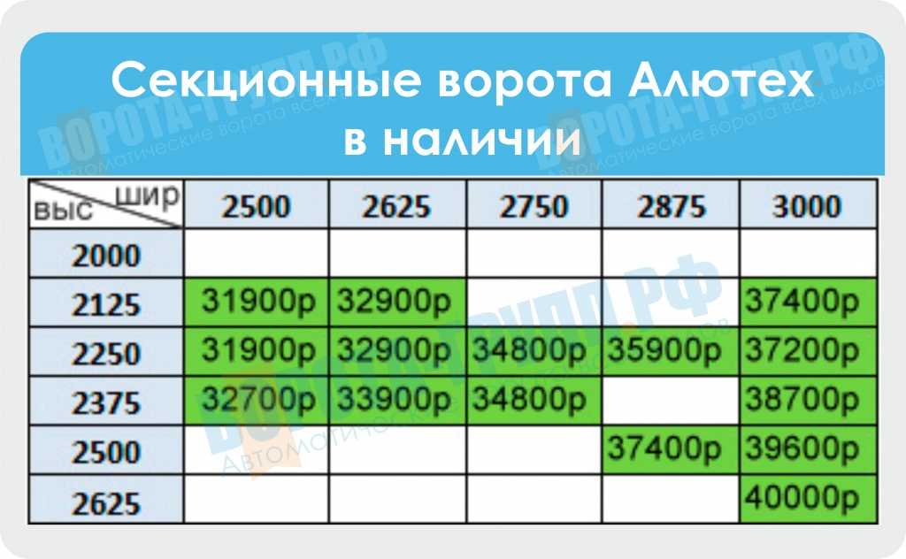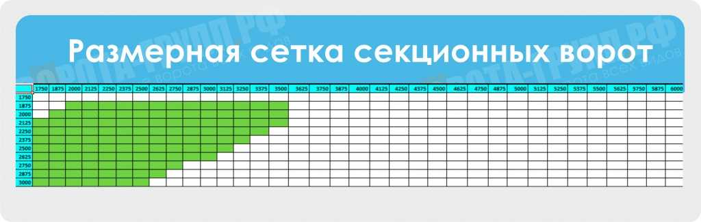 Полная размерная таблица секционных ворот Алютех. Ширина до 6м, высота до 3м. Зеленым выделены ворота с пружинами растяжения, белым с торсионными пружинами.