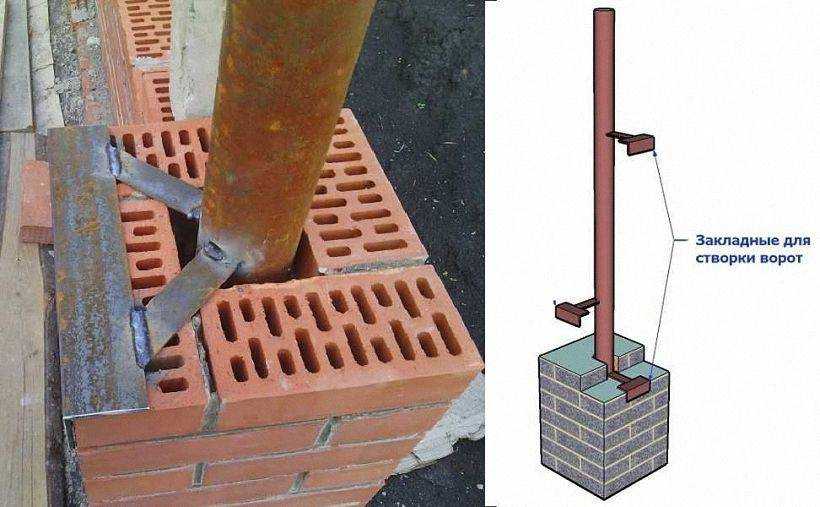 Столбы из кирпича конструктивно представляют собой забетонированную трубу, которую впоследствии обкладывают кирпичом. Такие опоры требуют как минимум мелкозаглубленного фундамента, который надежно связывает их между собой и предотвращает вероятность перекоса