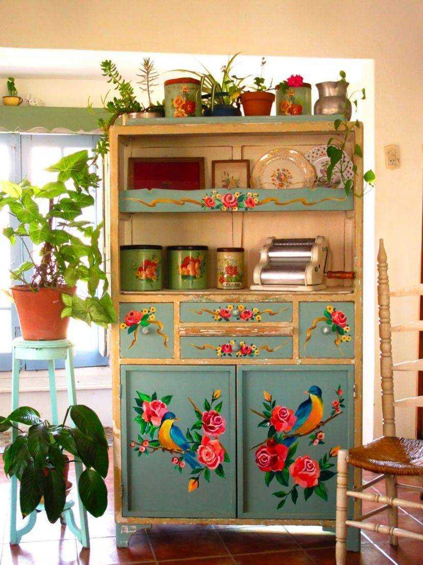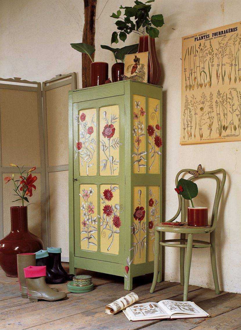 В домашних условиях очень удобно пользоваться наклейками или трафаретом. Геометрические узоры или цветы отлично скроют любые недостатки поверхности и освежат изделие. К тому же это не займет у вас много времени, главное, правильно оформить рисунок. Правильные формы трафаретов отлично вписываются в современные дизайны и придают шкафу современный вид.