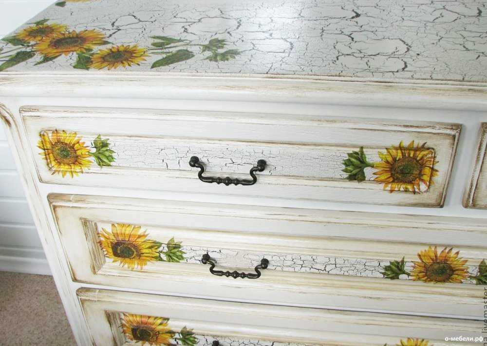 - При декорировании шкафов и комодов рекомендуется снять ручки, даже если они подойдут к стилю измененного изделия. Так фурнитура не испачкается и декорировать изделие будет удобнее.