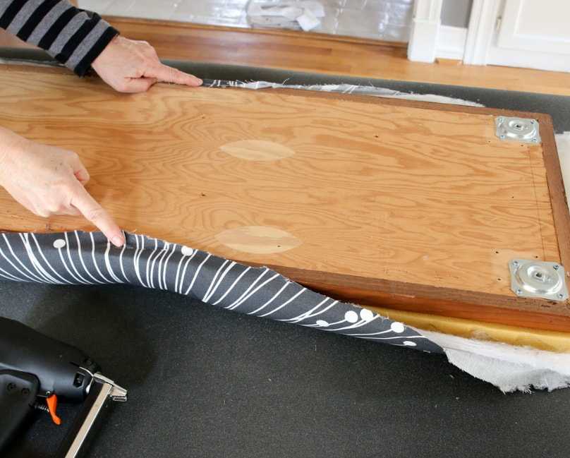 - натягиваем ткань на столешницу, загибаем и закрепляем ее мебельным степлером.