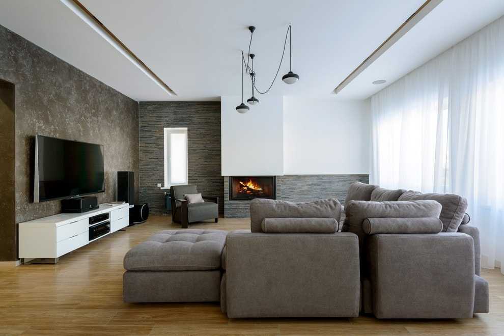 Стильная просторная гостиная с камином