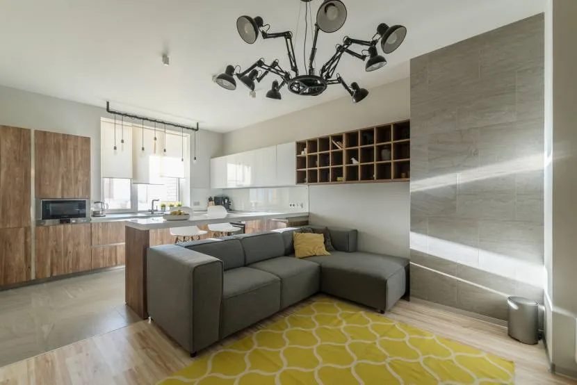 На фото модульный диван с оттоманкой серого цвета в интерьере современной кухни-гостиной.