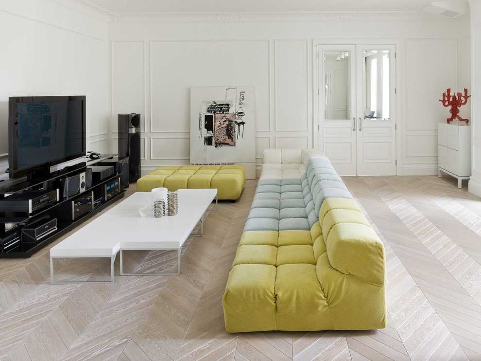- Модульный. Данная мебель считается настоящим конструктором и предполагает самые различные комбинации размещения, позволяющие видоизменять обстановку и концепт всего интерьера.
