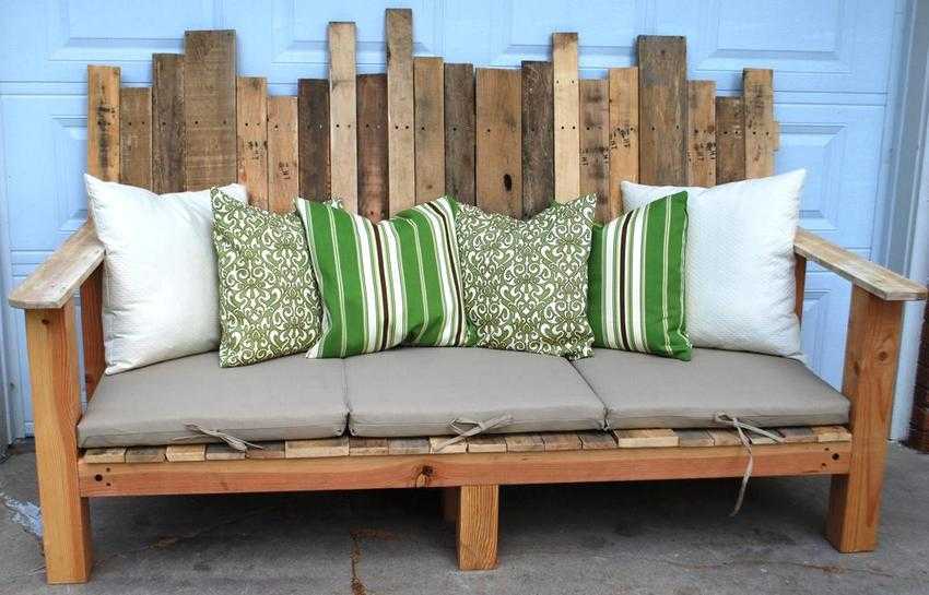 И здесь снова понадобится немного фантазии, чтобы придумать удобную конструкцию из имеющихся деталей. Поддоны можно разобрать на отдельные доски и использовать их, но это не обязательно. Достаточно собрать из них каркас дивана со спинкой и подлокотниками, скрепить все элементы вместе гвоздями или саморезами, а затем вырезать из поролона детали в соответствии с получившимися габаритами. Как и в предыдущем случае, их обтягивают тканью. А крепят на месте либо той же липучкой, либо резинками.