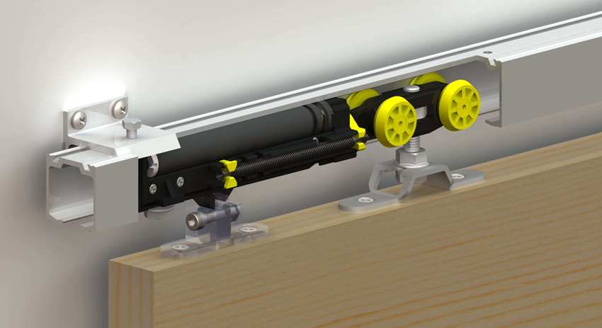 После этого полотно на роликах заводится в направляющие, его регулируют при помощи нижних роликов. Используется настроечный винт в нижней части створки возле ролика. Проверяют положение двери — оно во время хода должно быть вертикальным в обеих плоскостях. Затем ставят ограничители и фиксаторы и смотрят, не мешают ли они работе полотна. В завершение проверяют лёгкость и плавность хода, отсутствие люфтов.