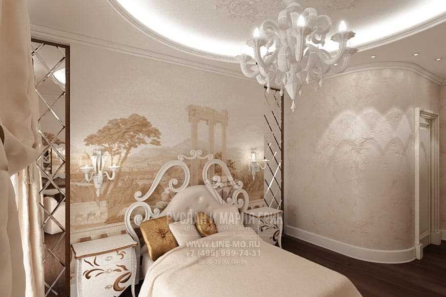 В интерьере спальни из портфолио Студии Руслана и Марии Грин используются фацетированные зеркальные вставки