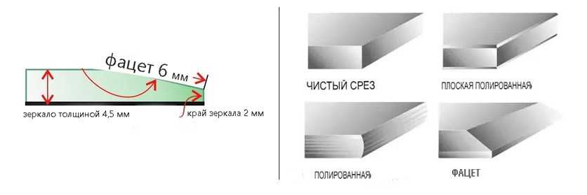 Фацет на зеркале бывает шлифованным и полированным. В первом случае край зеркала будет матовым, а во втором — прозрачным.