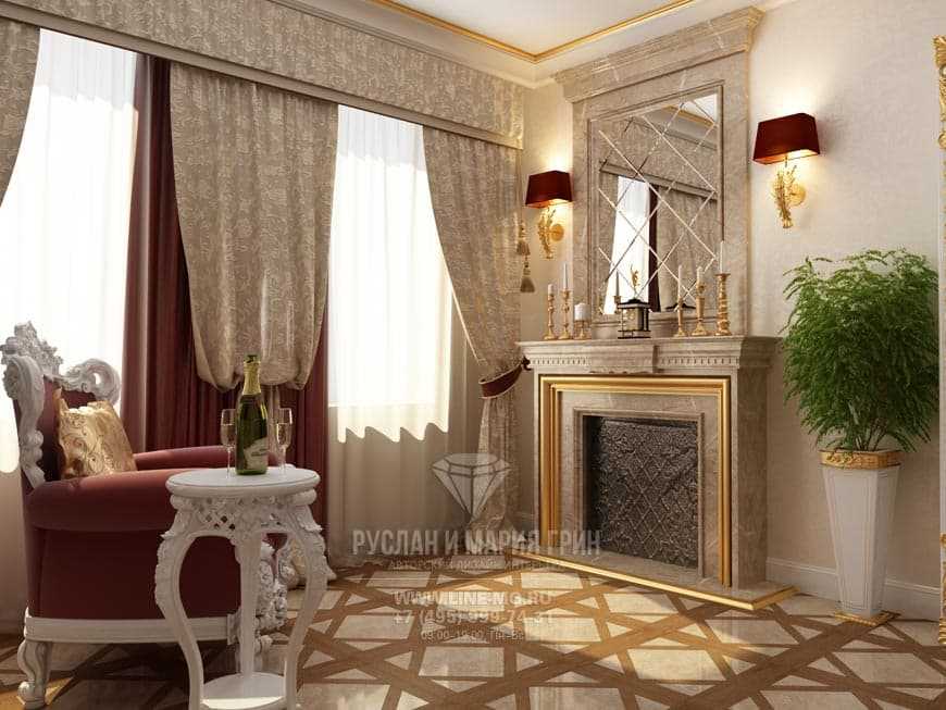 Распространены зеркала с фацетом и в дизайне гостиных. Здесь ими можно декорировать каминную зону. Фацетированное зеркальное панно над камином всегда придает помещению аристократический лоск, дублируя при этом стоящие на портале фигурки и канделябры.