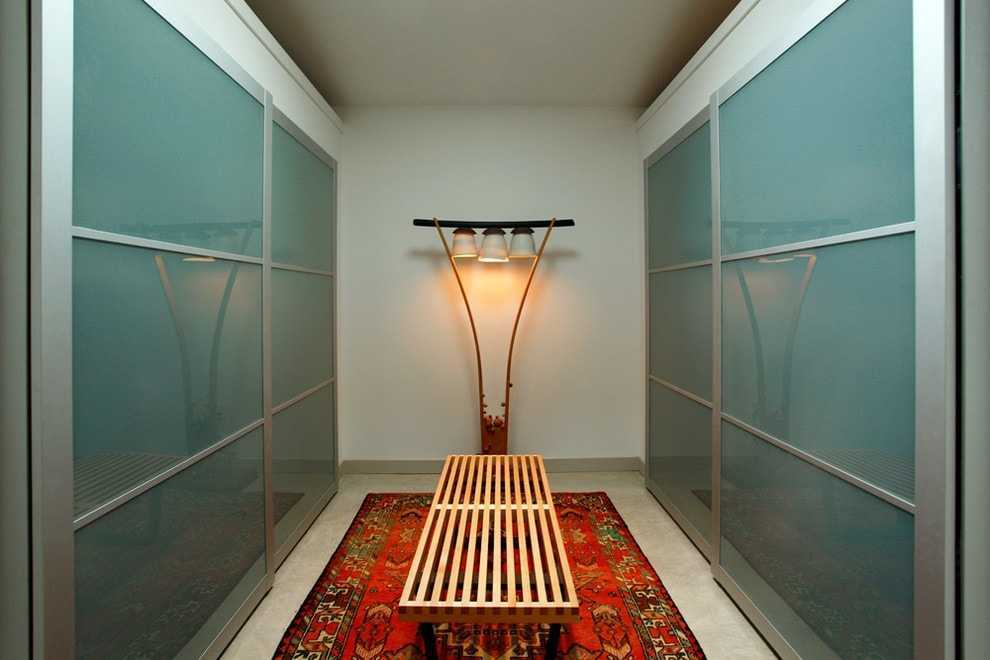 Для аккуратистов. Фасады шкафов нередко выполняют из стекла. Как правило его матируют либо покрывают цветной эмалью, чтобы полностью скрыть содержимое полок. Но у производителей премиум-класса нередко можно встретить двери из стекла – дымчатого, бронзового или даже экстрапрозрачного (без малейшего «бутылочного» оттенка). Это гардеробная для тех, кому незачем скрывать идеальный порядок на полках.