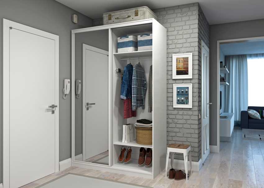 Обычно для прихожих подбирается компактная 2-вдерная конструкция средней или уменьшенной глубины с поперечными штангами для вешалок. Основные отсеки в шкафах для прихожей: