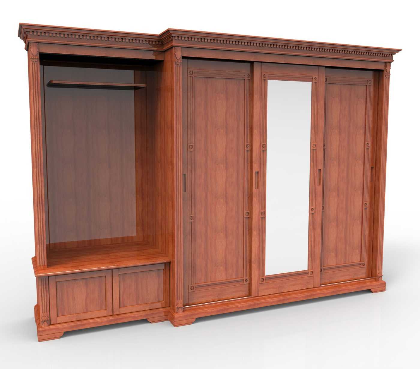Для изготовления шкафа купе в классический интерьер необходимы традиционные материалы, то есть массив дерева, шпон, покраска. Имитация филёнок классического фасада фрезеровкой МДФ с последующим покрытием пленкой – это всё отголоски прошлого.