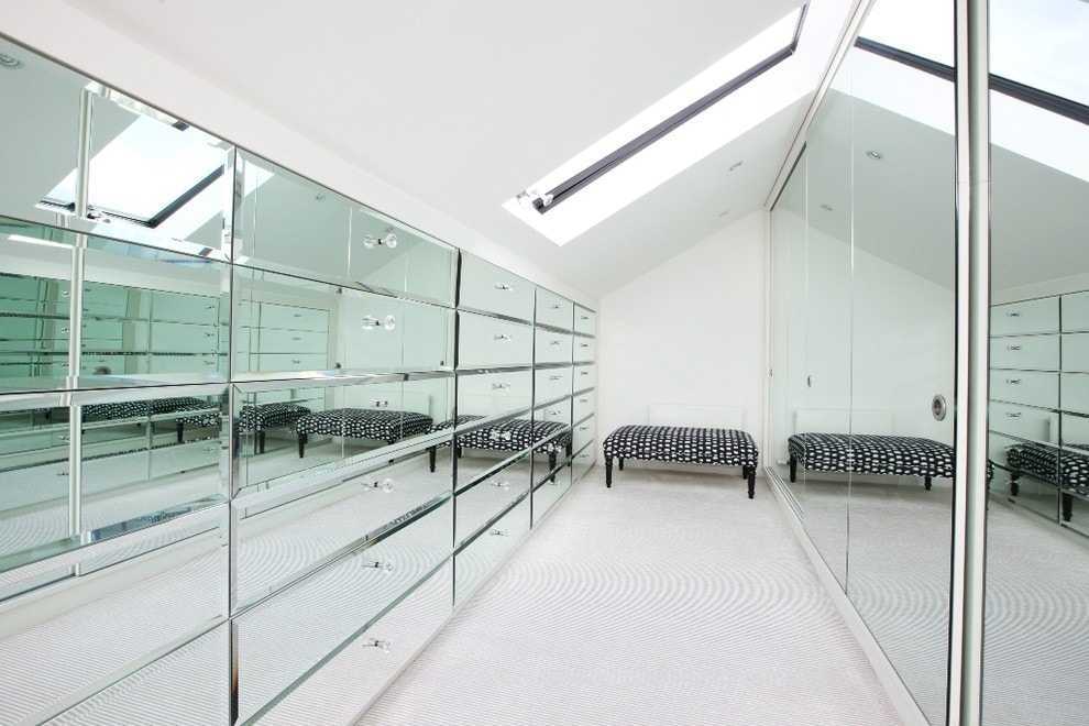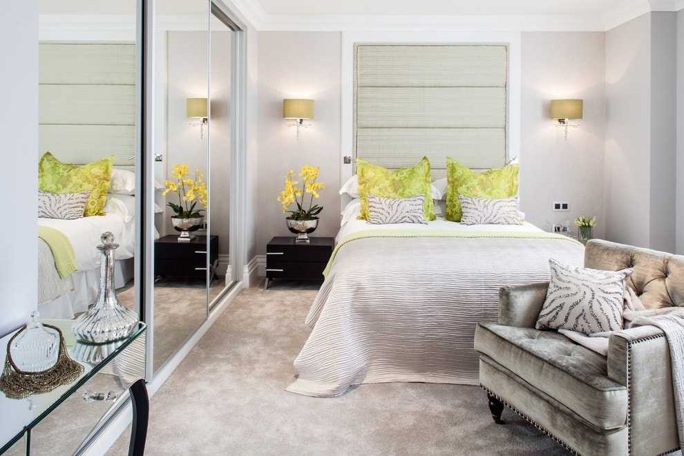 Гардероб на всю стену спальне может быть почти незаметен. Это связано с зеркальными фронтами, которые снабжены сдержанными ручками. Шкаф представляет собой действительно элегантную мебель. Зеркало отражает свет, увеличивая пространство. Стоит отметить, что мебель имеет различные размеры, поэтому вы можете легко организовать хранение как больших, так и мелких предметов одежды.