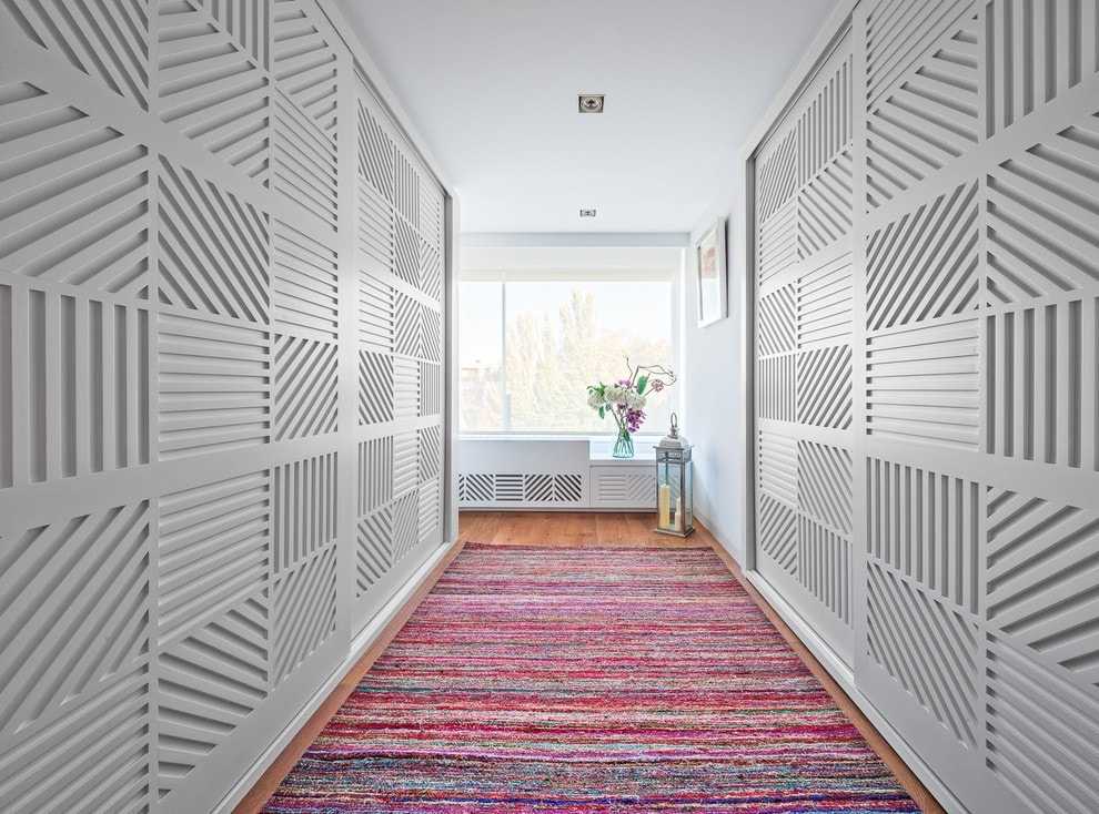 Фронты шкафа могут быть больше похожи на декоративные стеновые панели, чем на мебельную дверь для хранения одежды. Идею воплотить в реальность не трудно. Отличным примером будет вырезать отверстия на указанных высотах, которые одновременно могут служить не только декорацией, но и ручками неоднозначного размера, в любом количестве. Все зависит от вашей фантазии. Вы также можете выбрать другие формы отверстий — треугольники, бриллианты, шестиугольники. Интересные детали фасада шкафа-купе будут всегда привлекательными для глаз.