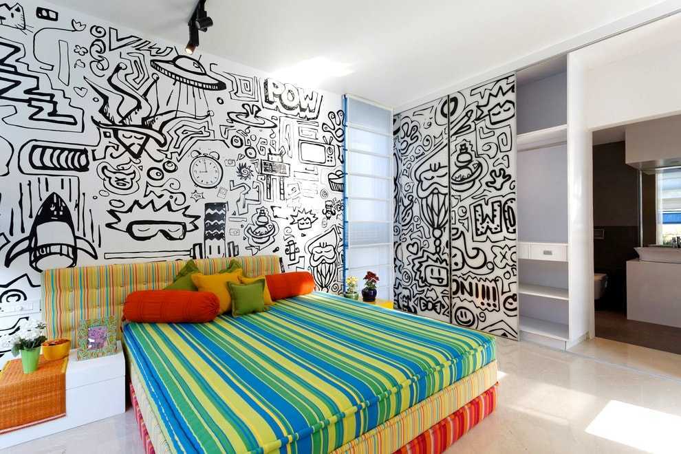 - детская должна быть выполнена в ярких тонах. Как вариант можно нанести на глянцевый фасад изображения героев сказок или оригинальные узоры;