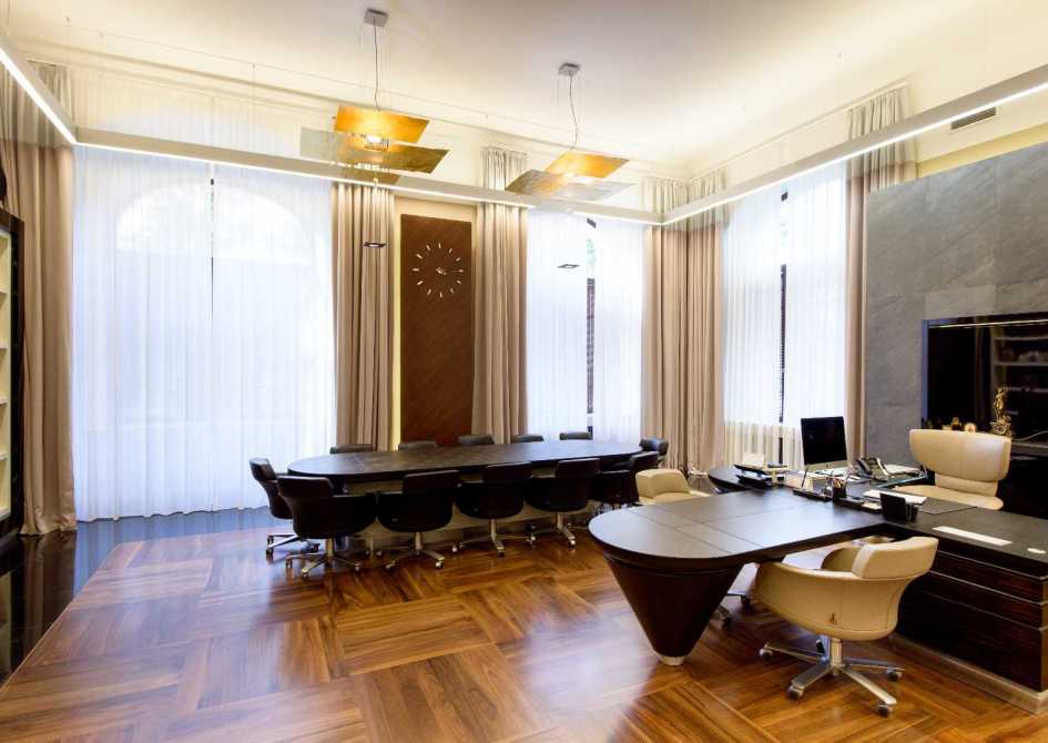При оформлении директорского кабинета дизайнеру предстоит решить непростую задачу. Во-первых, мебель должна отвечать стилистике офиса в целом. Во-вторых, она должна быть роскошной и статусной, дороже, чем в кабинетах начальников отделов или главного бухгалтера.