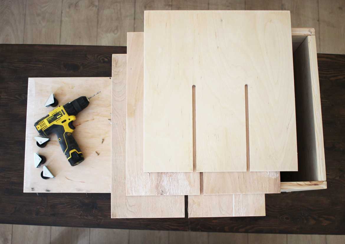 Шаг 1. Рассчитайте высоту, ширину и глубину базовой коробки и вырежьте куски фанеры для каждой стороны конструкции. Чтобы линия среза была максимально ровной и аккуратной, рекомендуется использовать электролобзик.