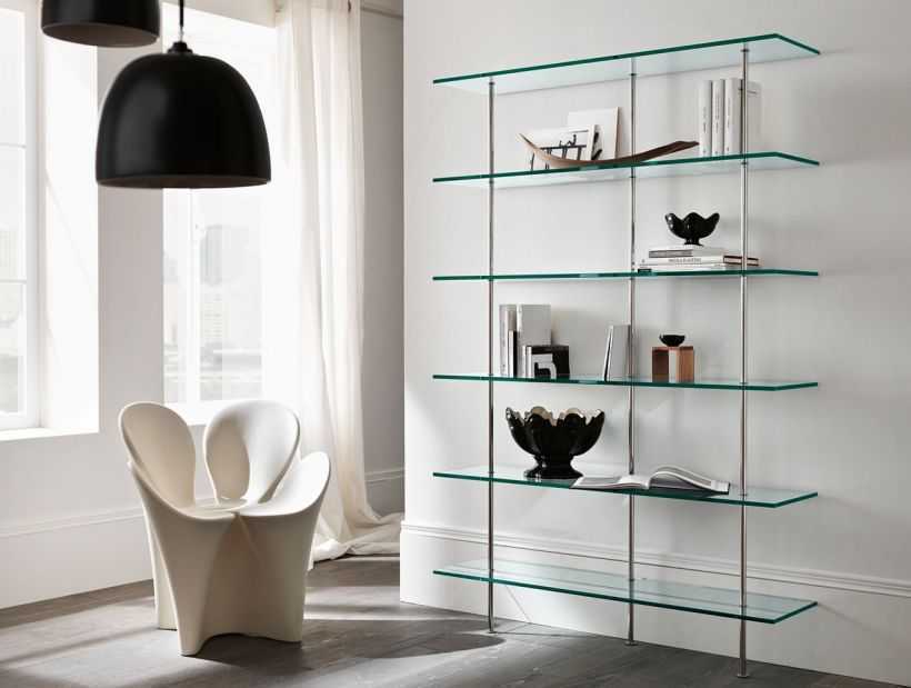 Современный и стильный вид могут придать полочки из стекла. Визуально такое решение выглядит непрочным, но на самом деле со своей задачей полки справляются. Но для самостоятельного изготовления необходим опыт работы со стеклом.