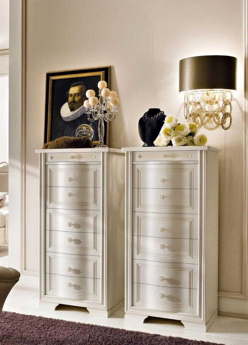 Для классически оформленных спален иногда приобретают высокие комоды – от 130 см. Разместив на них лампу, можно получить рассеянный мягкий свет, создающий дополнительный уют.