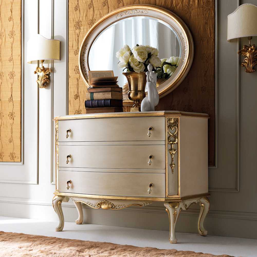 Трюмо в гостиной. В общей комнате, куда приглашают гостей, такой столик становится центральным элементом обстановки. Это по-прежнему столик для мелочей с зеркалом. Чаще всего с ящичками. Но теперь это шик, это предмет гордости, это произведение искусства с приятным дополнением в виде возможности посмотреть на себя в зеркало. Даже рама зеркала завораживает своей роскошью.