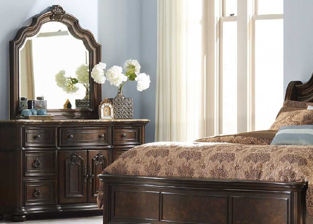 Очень красиво смотрится, если комод с зеркалом для спальни и кровать имеют одинаковый дизайн