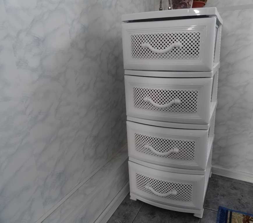 Пластик. Прочностью и долговечностью материал не отличается, однако плохо впитывает влагу, из-за чего устанавливают комоды в ванной или на кухне.