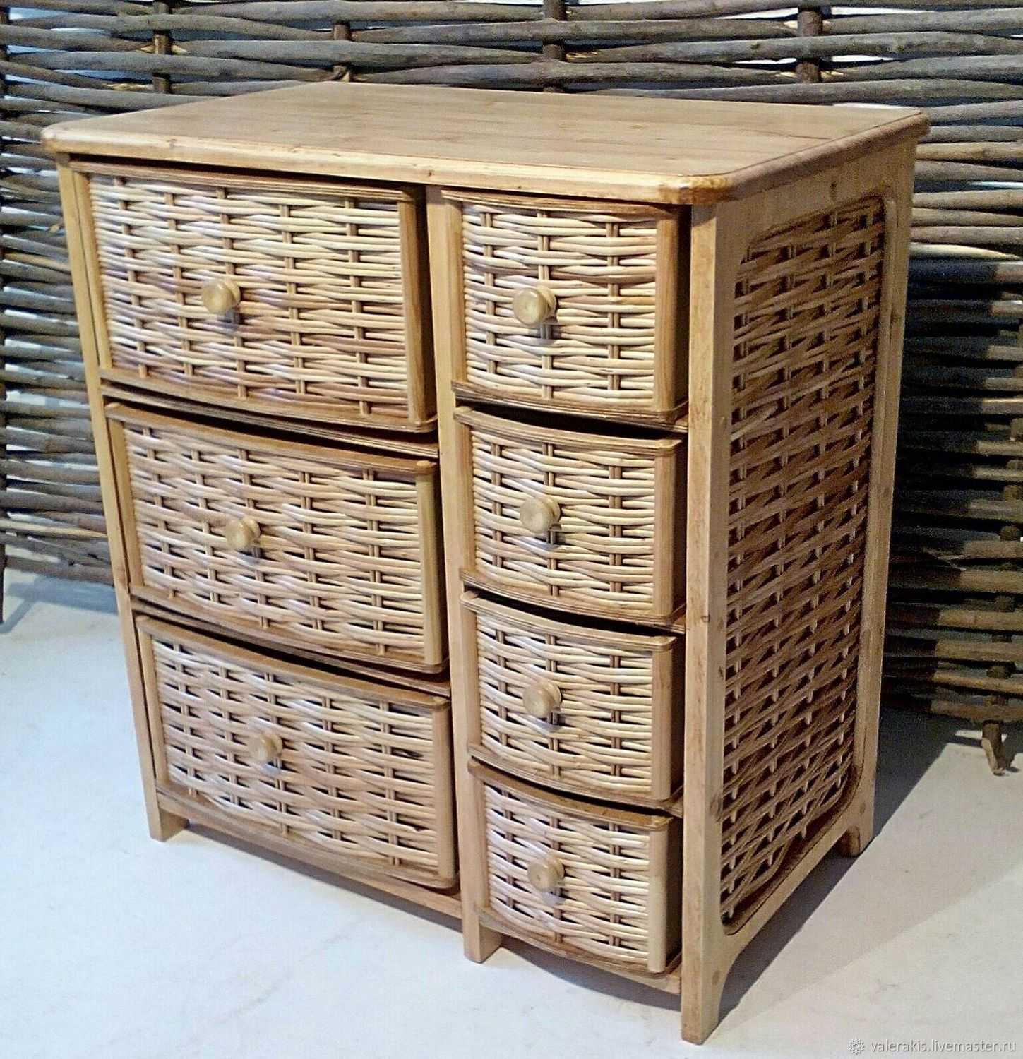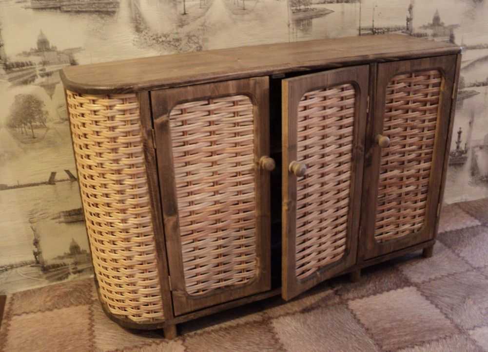 Ротанг. Такой комод плетеный, наиболее экологически безопасный, прочный и легкий. Он придаст экзотики в интерьер, используется в стиле прованс, эко стиле, скандинавском.