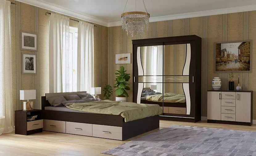 Несколько лет назад были популярны спальные гарнитуры с добавлением молочного оттенка. Сегодня они выглядят устарело, поэтому если хотите всю мебель в одном цвете и стиле — берите полностью темную. А чтобы нивелировать громоздкость, выбирайте минималистичный дизайн. Сделать атмосферу уютнее помогут светлые стены и пол, белый или кремовый декор, текстиль.
