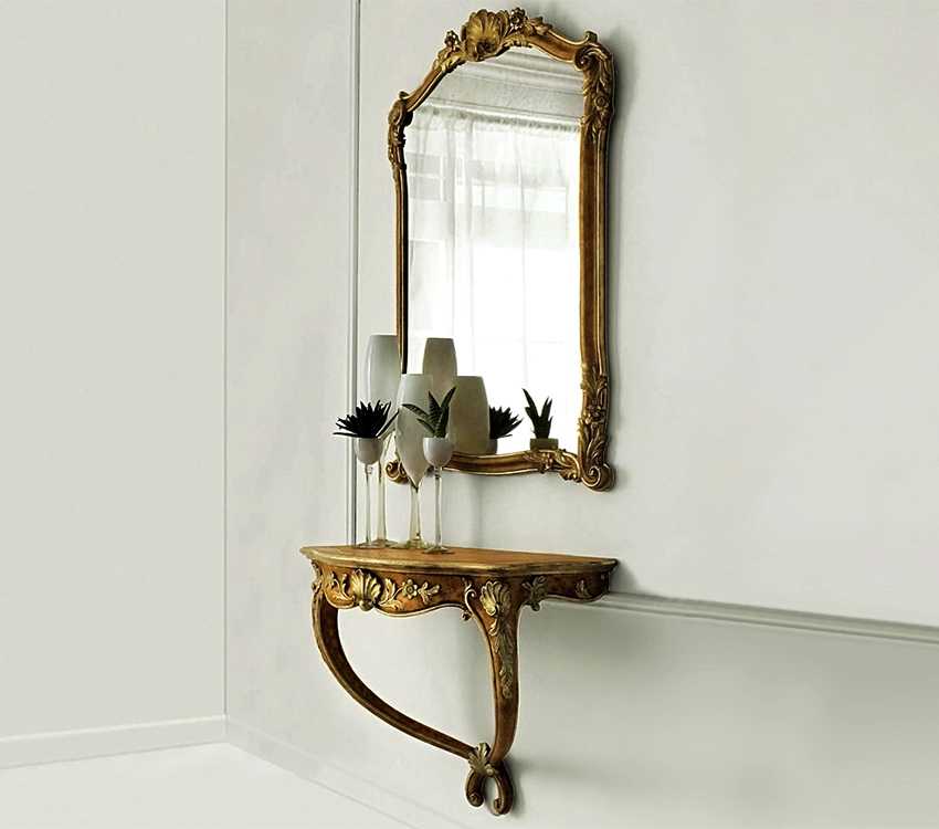 - зеркальные консольные столики (изделия украшаются кусочками зеркал или комплектуются полноценным зеркалом, которое крепится к стене непосредственно над конструкцией);