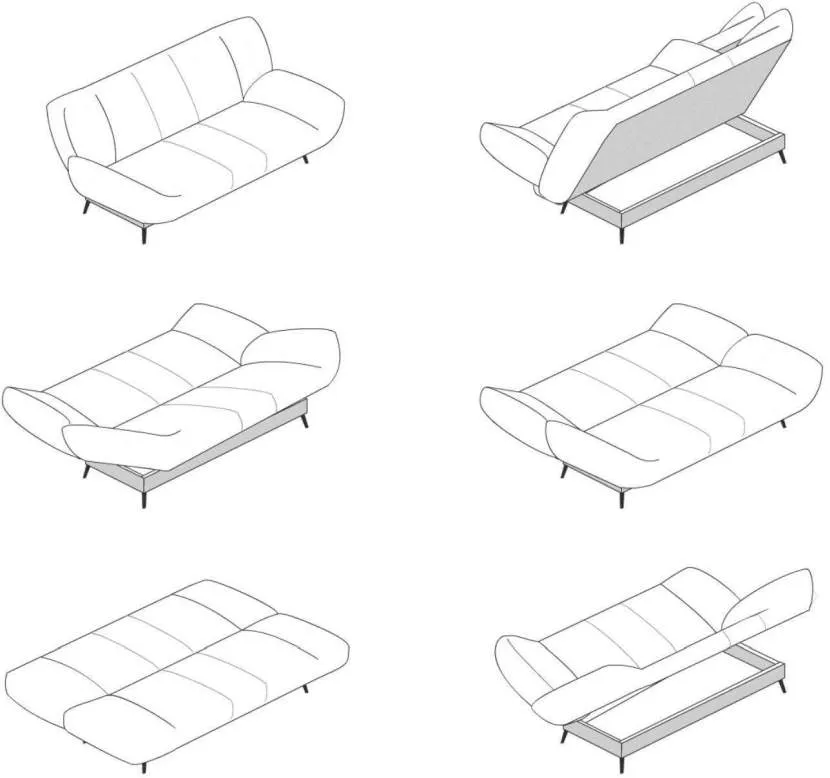 «Книжка». Самый простой тип механизмов (поэтому сломать его трудно), название получил по сходству двух половинок мебели с открытой книгой. Чтобы раскрыть диван, сиденье поднимают до щелчка и опускают; одновременно опускается и спинка. Минус: в месте соединения половинок имеется ложбинка, из-за чего спальное место получается неровным.