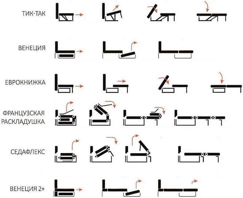 Раскладушка. Конструкция из трех секций; в собранном виде находится внутри дивана, в разобранном – опирается на ножки. Существует несколько разновидностей: французская, итальянская, американская, которые отличаются деталями механизма, способом организации каркаса, и тем, нужно ли снимать спинку и сиденье.