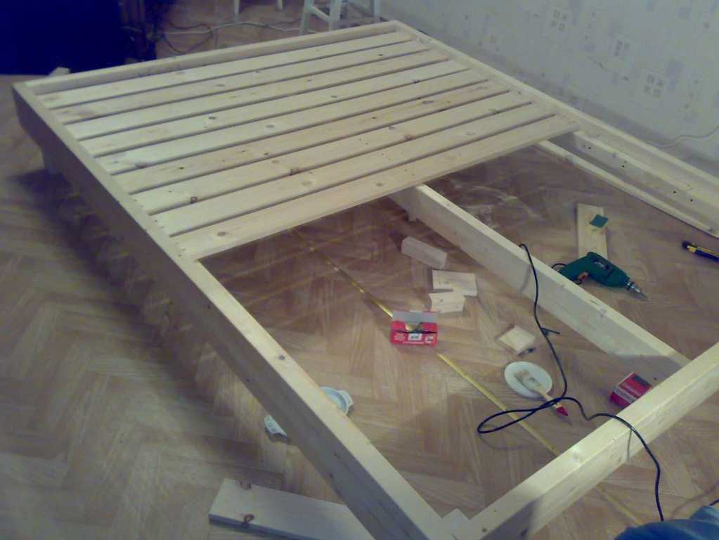 Дно каркаса, где будет размещаться матрас, предпочтительнее сделать из реек, хотя можно, при необходимости, изготовить сплошным, из фанеры толщиной 10 мм.