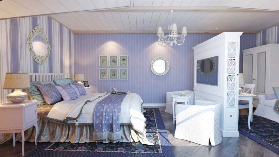 Стиль ассоциируется, прежде всего, с лавандовыми полями, поэтому оформление стен в нежных сиреневых тонах будет очень даже кстати. Кроме лавандовых мотивов, можно использовать светло-бежевые или кремовые оттенки, светло-жёлтый, голубой цвета и даже немного розового. Разумеется, не нужно забывать о белом — он станет преобладающим в отделке стен. Однако как вариант можно рассмотреть и отделку камнем.