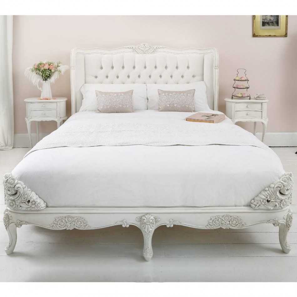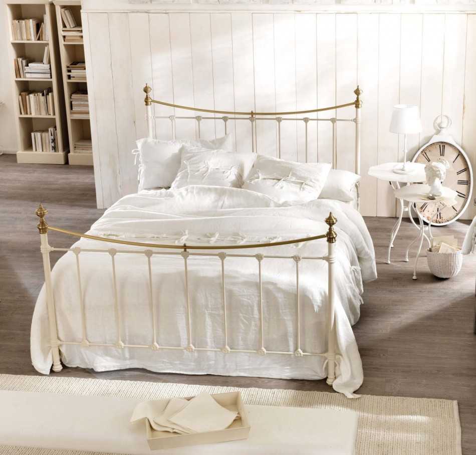 Кровати — деревянные или металлические, с обязательной спинкой, которую можно оформить в белом цвете. При этом кровать в достаточно простом, даже грубоватом исполнении может иметь резную спинку. Если каркас кровати — из металла, то спинка непременно должна быть кованой, или декорирована резными элементами.
