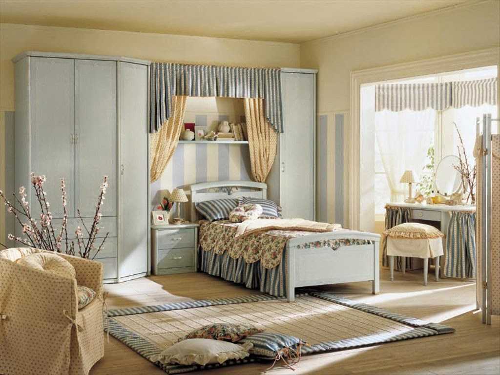 При оформлении можно использовать различные покрывала для кроватей. Покрывало должно быть с цветочными мотивами, но оно может быть и однотонным. На нем могут быть изображены как клетки, так и полоски.