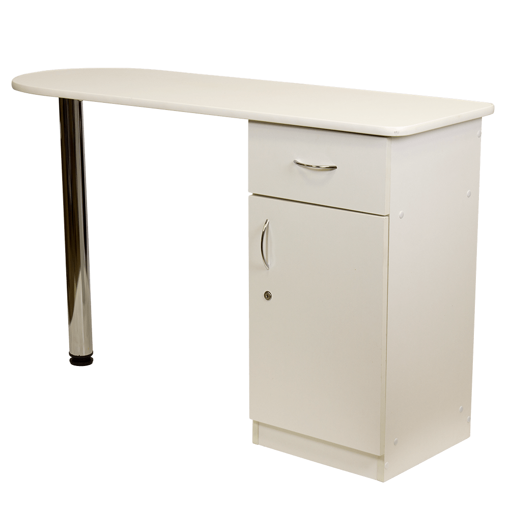 Самый простой вариант маникюрного столика эконом-класса. Он имеет изогнутую столешницу без углов и тумбу с выдвижным ящиком и полками. Такой вариант столика подойдет для домашнего применения или для маленького салона с небольшим потоком клиентов и выполнением только классического маникюра.